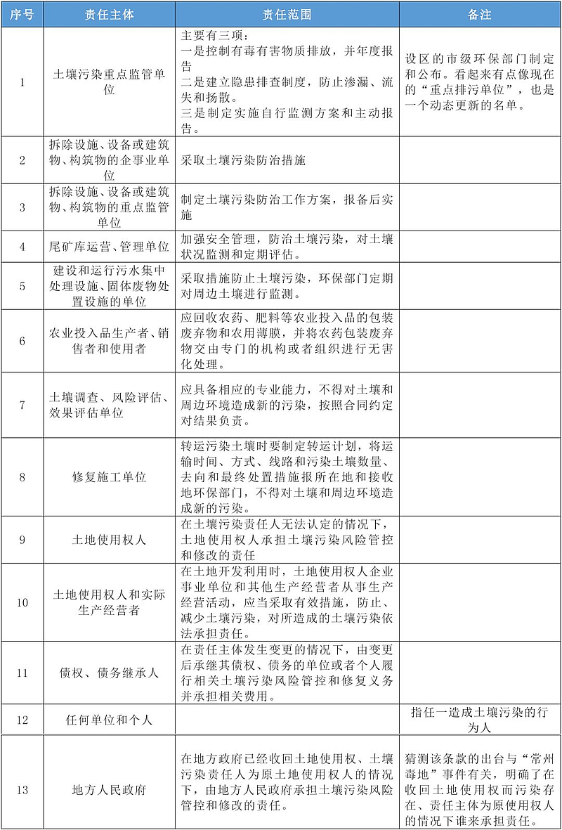 在《土壤污染防治法》,土壤污染责任人一词共出现29次,总结起来主要包括以下13类: